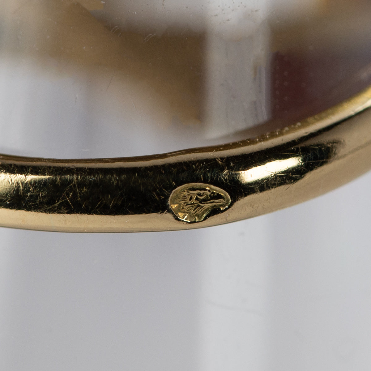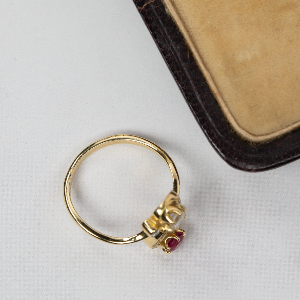 本リングは、20世紀後半以降に制作されたヴィンテージのトワエモワリングを象徴する色使いです。アールデコ以前のジュエリーを主にご紹介している当店ですが、このヴィンテージリングの魅力にも心惹かれました。アンティークのトワエモワを見慣れた目に、銀白色の金属ではなくゴールドで仕立てられた台座台座が新鮮に映り、惹きつけられたのです。さらに、9号という小ぶりなサイズも上品な印象を与えており、このリングの魅力を一層引き立てています。
