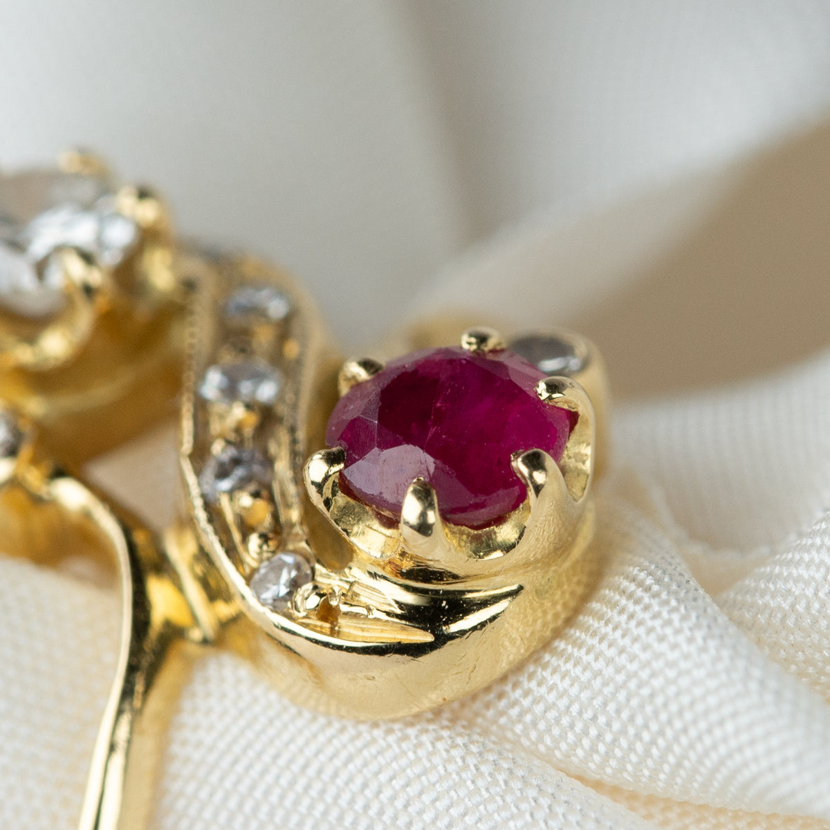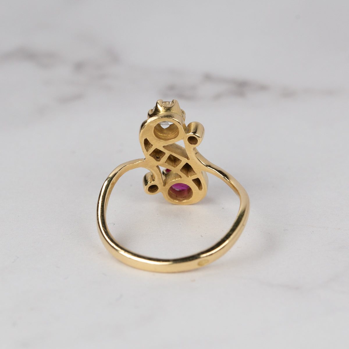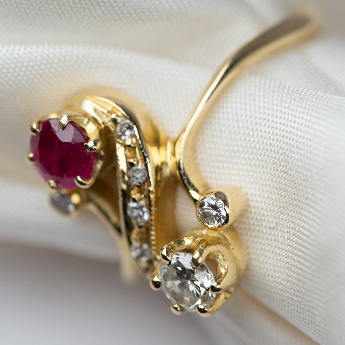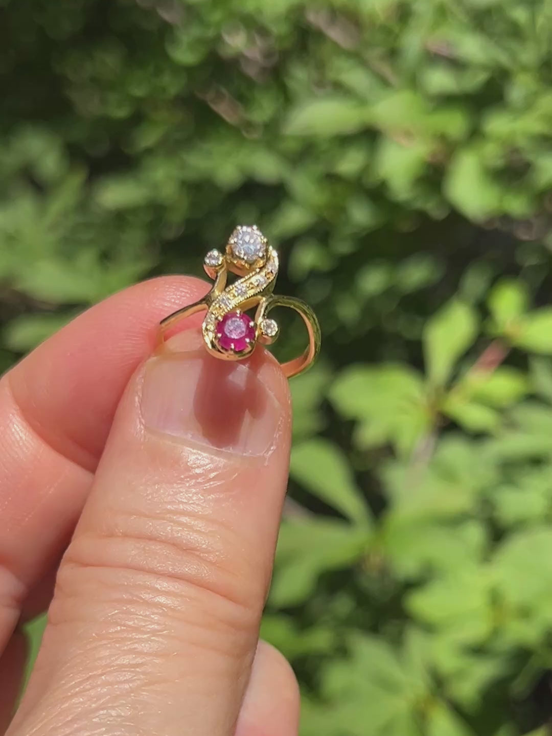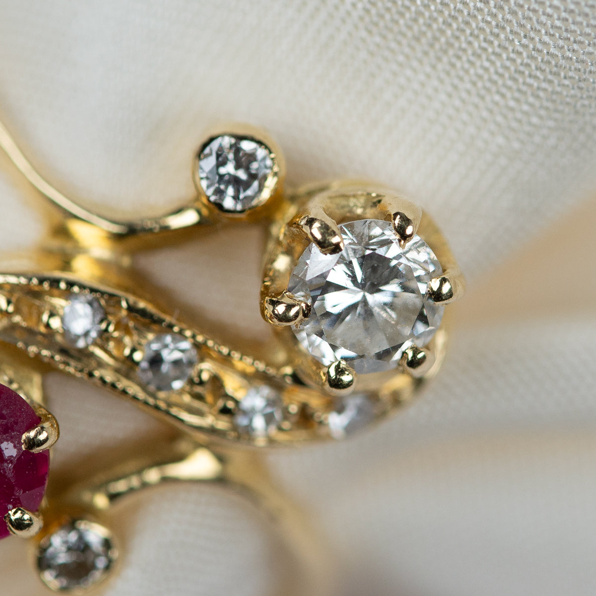 メインのダイヤモンドとメインストーンの脇石はラウンドブリリアントカット、S字台座のダイヤはクラシカルなシングルカット(8/8)で、いずれの輝きも強く華やかです。ルビーを高倍率ルーペで確認すると、表面のキャビティも含め多少のインクルージョンが見られますが、天然石ならではの個性としてお楽しみください。シャンクには、18Kを示すフランスのイーグルヘッド刻印が押印されています。