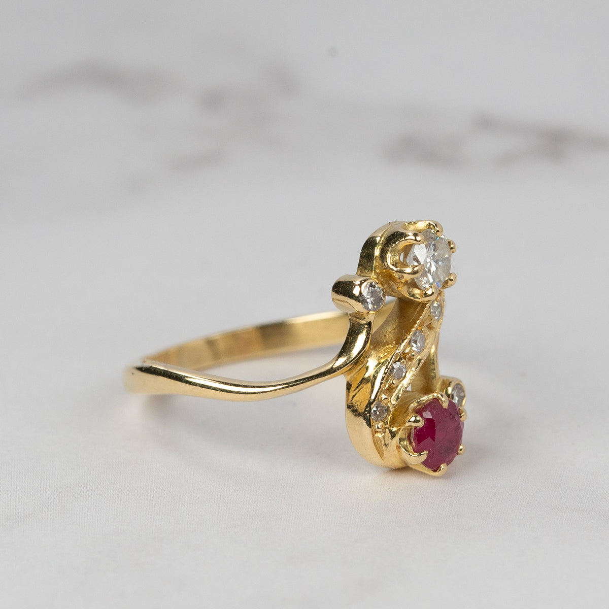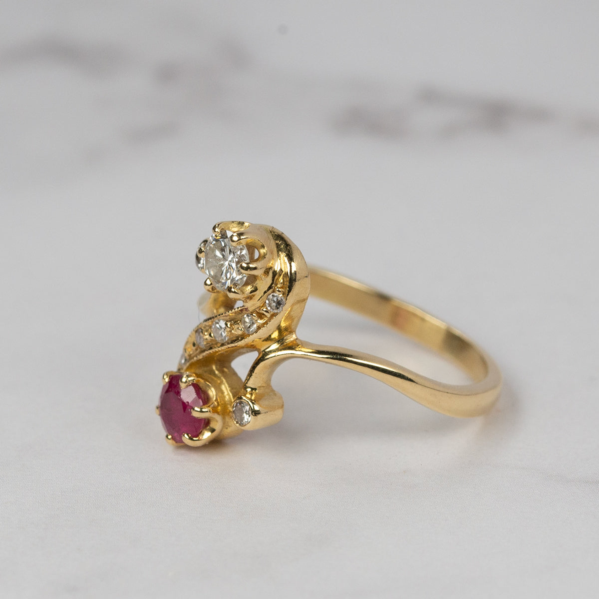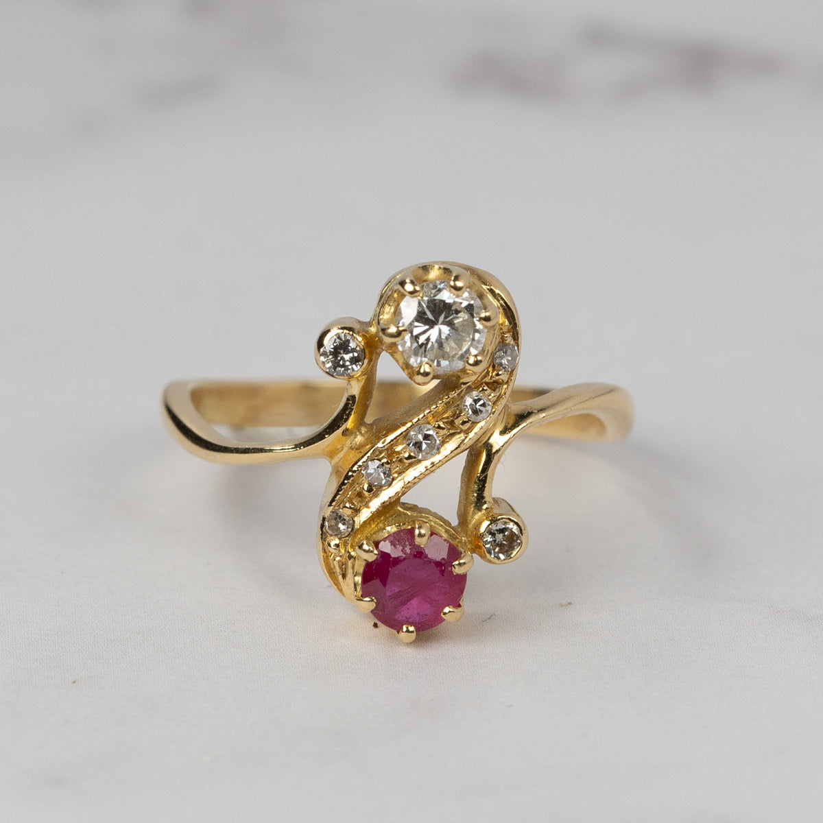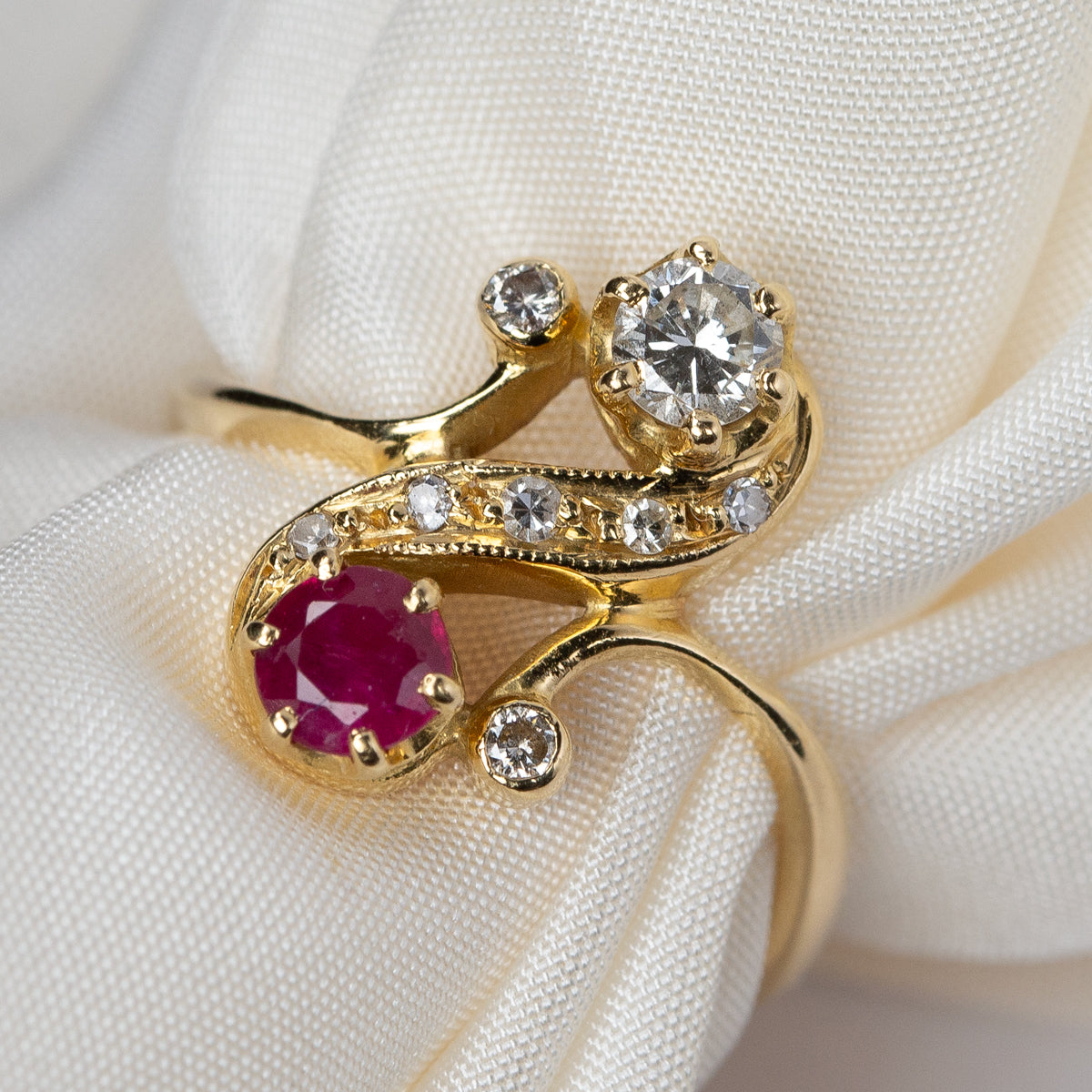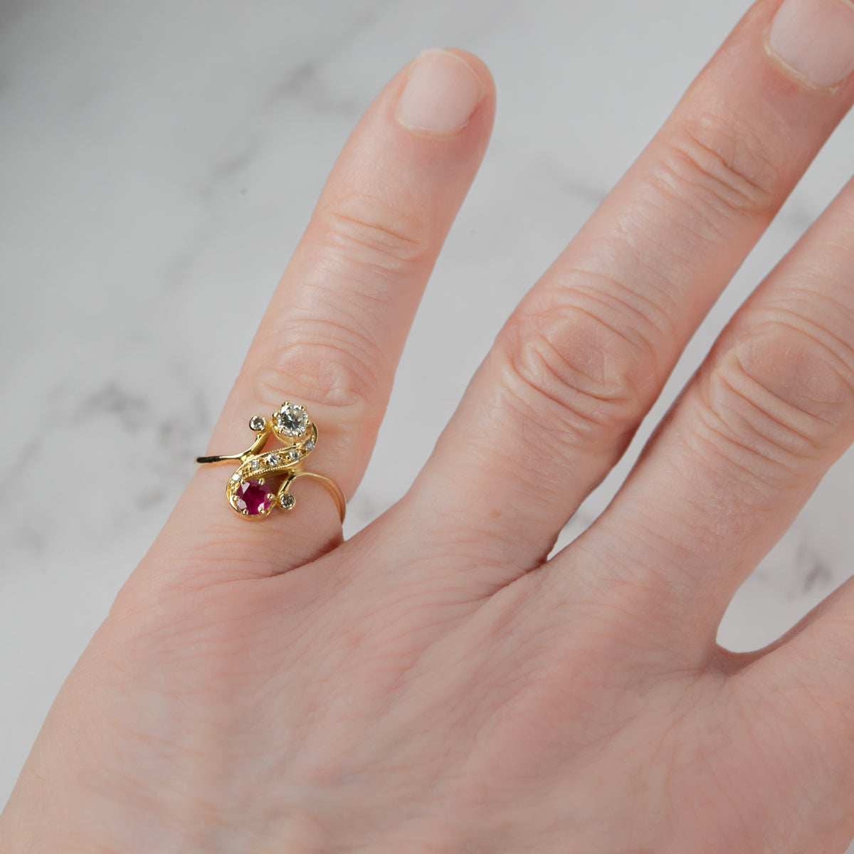 メインのダイヤモンドとメインストーンの脇石はラウンドブリリアントカット、S字台座のダイヤはクラシカルなシングルカット(8/8)で、いずれの輝きも強く華やかです。ルビーを高倍率ルーペで確認すると、表面のキャビティも含め多少のインクルージョンが見られますが、天然石ならではの個性としてお楽しみください。シャンクには、18Kを示すフランスのイーグルヘッド刻印が押印されています。